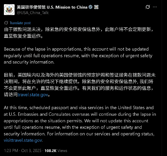 美驻华使领馆官号宣布停更美驻华使领馆官号宣布停更