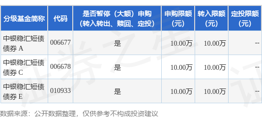 本站消息忠琦配资,9月29日中银基金管理有限公司发布《关于中银稳汇短债债券型证券投资基金暂停大额申购、转换转入及定期定额投资业务的公告》。公告中提示,为保护基金份额持有人利益,自2025年9月29日起中银稳汇短债债券型证券投资基金暂停大额申购、转换转入及定期定额投资业务,申购、转换转入上限金额为10.0万元,下属分级基金调整明细如下: